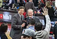 The first half of the season produced mixed results as Toronto struggled towards the .500 mark.[103] After the All-Star break, Bargnani continued to work on his defence and shooting (averaging 14.3 points per game and 3.9 rebounds per game in 12 games for the month of February 2007), and he was selected as the Eastern Conference Rookie of the Month for the second straight time on March 1, 2007.[104] Bargnani became the third Raptor ever to win the award twice, joining Vince Carter and Damon Stoudamire.[104] Toronto ended the regular season with a 47–35 record, securing the third seed in the Eastern Conference for the 2007 NBA playoffs along with the Atlantic Division title, as well as homecourt advantage for the first time in franchise history.[105][106] Bosh was voted to start in the 2007 NBA All-Star Game.[107] The Raptors were also praised for their improved defence, ball-sharing and tremendous team chemistry.[108] Colangelo, Gherardini and Mitchell were credited with Toronto's turnaround this season,[109] which was one of the best in NBA history in terms of league standing and defensive ranking.[110] Mitchell was subsequently named the 2006–07 NBA Coach of the Year, the first coach in Raptors history to receive the honour,[111] while Colangelo was named 2006–07 Executive of the Year.[112]
