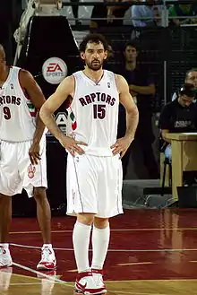 The inevitable roster shakeup for the 2009–10 season began when Kapono was traded to the Philadelphia 76ers for the aggressive veteran forward Reggie Evans.[130] Toronto then drafted DeMar DeRozan with the ninth pick, enabling them to fill a spot on the wings.[131] This was followed by the signing of free agent Hedo Türkoğlu, which in turn led to a sign-and-trade agreement involving four teams, with Toronto landing wing players Devean George (later traded for Marco Belinelli) and Antoine Wright, while releasing Marion, Kris Humphries and Nathan Jawai.[132] Around the same time, Parker headed for the Cleveland Cavaliers,[133] while Indiana point guard Jarrett Jack was added and Nesterovič brought back to provide cover for the big men. Finally, Delfino and Ukić were moved to the Milwaukee Bucks for Amir Johnson and Sonny Weems.[134] It became increasingly clear that Colangelo, in securing a credible nucleus for the future, was doing this to persuade Bosh to stay beyond 2010.[135] While the Raptors were off to a sluggish start, they picked up the pace around the All-Star break, reaching a season-high seven games above .500 and standing fifth in the Eastern Conference.[136] Bosh was recording career-highs in points and rebounds per game.[75] However, a season-ending injury to Bosh after the break coincided with Toronto's descent down the standings from the fifth seed to the eighth, and they ultimately relinquished their spot to Chicago a few games before the regular season ended.[137]