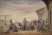 In 1864, delegates from the Charlottetown and Quebec City conferences on the Canadian Confederation were welcomed at this station by a huge crowd which then escorted the delegates to the Queen's Hotel on Front Street.[6] In 1866, the Great Western opened its own station at Yonge Street.[7] It was the first station in Toronto to provide a covered train shed.[7] In 1867, the Northern opened its City Hall station at Jarvis Street.[8]