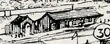 As a consequence, the Grand Trunk Railway (GTR) built the first union station in Toronto in 1858 at a location just west of the present Union Station train shed.[4] The location was landfill, south-west of Front and York Streets, then the intersection of York Street and The Esplanade along the water.[5] The station consisted of three wooden structures and was initially shared with the Northern Railway of Canada (as the Ontario, Simcoe & Huron was renamed) and the Great Western Railway, although both railways had already built their own stations along the Toronto waterfront.[2] It was Canada's first union station.[2]