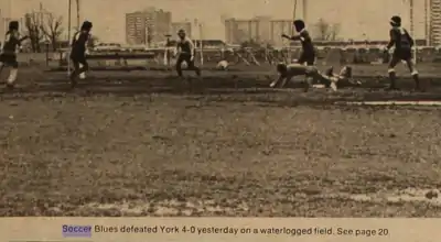 The 1972 squad was a mix of old and new players: Mario Da Rosa, Vito Polera, Vince Ierullo, Bob Cazzola, Tim Burns, Joe Dattolico, Bruno Bruni as well as a Peter Hillier, Ian Harris, Eugene Konarsky, Ed Cortes and John Cobby. By 1972, the OUAA soccer East division included Ryerson, Queen's, York, Trent, Carleton while the West was made up of McMaster, Toronto, Waterloo, Western, Guelph, Laurentian and Brock. Captained by Cazzorla, the Varsity Blues opened the season with a 3–0 win against Waterloo at Varsity Stadium. After five games played, the Varsity Blues had won three and drawn two and had only allowed 2 goals against. Eight games in, they had six wins and two draws and still only 3 goals against. The crucial game against McMaster was played at Varsity Stadium — the winning team assured of the West division title. The Marauders had 40 goals forward, the most in the league, while the Varsity Blues had the least against. The Varsity Blues won 1–0. In the final weekend of the regular season, the Varsity Blues defeated Guelph and Laurentian to finish atop the West division table with a 9-0-2 (W-L-T) record and 31 goals for and 7 against. The following weekend, on a York University field described by The Varsity (newspaper) as just "rain and mud", the Varsity Blues defeated York in the OUAA final and clinched a Nationals semi-final berth against Alberta. The Varsity said that "even York's twelfth man on the field — a huge defensive puddle halfway between the York goal and the centre line — offered little aid [to York in limiting the 4-0 Blues lead]". In the Varsity Blues first ever appearance at CIAU Nationals, they were defeated 2-0 by the Alberta Golden Bears at York University. This was their first defeat of the season. The Toronto school newspaper mentioned that the Varsity Blues had a "their first flat day [of the season]" and that "Alberta deserved its victory". The Golden Bears would go on to win in the final and become the 1972 National Champions.[15]