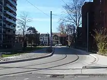 McCaul is an anticlockwise loop northeast of McCaul Street and Stephanie Street. It is the western terminus of the 502 Downtowner and a turnback point for the 501 Queen in either direction. Streetcars travelling both ways on Queen can turn north onto McCaul and then can turn into the loop, exiting onto McCaul southbound to return to Queen either eastbound or westbound. The loop was originally in the open air, but was covered when the Village by the Grange mixed-use development was built over it in 1976.[7] The minimum radius of curvature for this loop is 13.7 m (45 ft).[2]