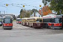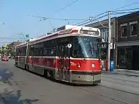 In 1921, the Toronto Transportation Commission (TTC) was created to integrate and operate the Toronto streetcar system. It inherited the infrastructure of two separate streetcar operators: the Toronto Railway Company (TRC) and Toronto Civic Railways (TCR). The TTC immediately embarked on a program to connect the TRC and TCR lines into one network. The TTC had to rebuild most of the track to provide a wider devilstrip so that the wider Peter Witt streetcars it was ordering could pass without sideswiping.[1] Between 1938 and 1945, it placed five orders for air-electric PCC streetcars to replace the old, wooden streetcars of the TRC, and to address rising ridership. Between 1947 and 1951, the TTC placed three orders for all-electric PCC cars, with one order equipped with couplers for multiple-unit operation. Between 1950 and 1957, the TTC purchased PCCs from four American cities (Cincinnati, Cleveland, Birmingham and Kansas City). By 1957, the TTC (later renamed the Toronto Transit Commission in 1954, which uses the same acronym) had more PCCs than any other city in North America. After the opening of the Bloor–Danforth subway (today Line 2 Bloor–Danforth) in 1966, the TTC considered terminating all streetcar service in Toronto. However, in 1972, a citizens group led by Jane Jacobs and Steve Munro called "Streetcars for Toronto" persuaded the City to retain streetcar operation.[2] This led to the development of the Canadian Light Rail Vehicle (CLRV) and its longer, articulated cousin, the Articulated Light Rail Vehicle (ALRV), to replace the aging PCC fleet. The Accessibility for Ontarians with Disabilities Act, 2005 (AODA) mandated that the next generation of streetcars be wheelchair-accessible. Thus, to replace the CLRVs and ALRVs, Bombardier adapted its low-floor Flexity Outlook model for the TTC to navigate the Toronto streetcar system's tight curves and single-point switches, characteristics set in the 1920s to accommodate Peter Witt streetcars.