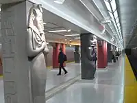 | College | Hockey Knights in Canada | Charles Pachter | Two-part installation depicting the Montreal Canadiens and Toronto Maple Leafs squaring off from opposite sides of the subway tracks, with the Canadiens on the northbound side and the Leafs on the southbound side. The station served the Maple Leaf Gardens when it was the main hockey arena in Toronto. | ![]() | |