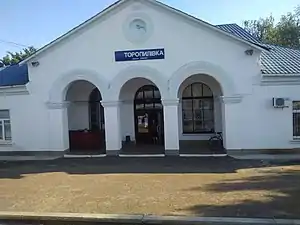 The station dates back to its opening in 1895.[1] The reason for the discovery was the construction of a sugar factory in 1893, which needed a railway to supply raw materials. The station probably got its name from the village of Toropylivka, which was located seven kilometres (4 mi) away. (The village no longer exists.)