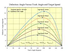 A number of publications[46][47] state the optimum torpedo track angle as 110° for a Mk 14 (46 knot weapon). Figure 4 shows a plot of the deflection angle versus track angle when the gyro angle is 0° (i.e.., θDeflection=θBearing).[48] Optimum track angle is defined as the point of minimum deflection angle sensitivity to track angle errors for a given target speed. This minimum occurs at the points of zero slope on the curves in Figure 4 (these points are marked by small triangles).