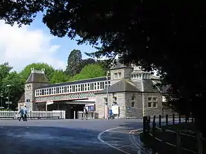 The station has two ranges of buildings, each 244 feet (74 m) long, built in local grey rubble stone on either platform. Deep canopies on composite iron and wood girders cover the platforms; there are further canopies on the road side of both buildings. the building which faces the sea at Abbey Sands and the town is used and this houses the ticket office and a café; the gate from this approach road is open when trains are running.[3] The one remaining signal box (now rented out for commercial purposes) is situated at the south end of this platform near a decorative cast iron bridge across the tracks. The station buildings are Grade II listed.[1]