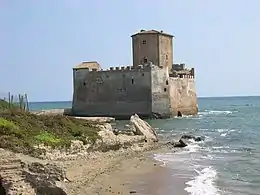 The island was at some time or other joined to the mainland by a bridge or causeway, and it thus became, as it now remains, a peninsula projecting into the sea. It is surmounted by a fortified tower, called the Torre di Astura, a picturesque object, conspicuous both from Antium and the Circeian headland, and the only one which breaks the monotony of the low and sandy coast between them. The medieval castle of the Frangipani family, in which Conradin vainly sought refuge after the battle of Tagliacozzo in 1268, is built upon the foundations of a very large villa, of opus reticulatum with later additions in brickwork, and with a small harbour attached to it on the south-east.[8] The castle was later a fief of the Caetani, the Orsini and the Colonna. Remains of buildings also exist behind the sand dunes, which possibly mark the line of the channel which separated the island from the mainland, and these may have belonged to the post-station on the Via Severiana.[8]