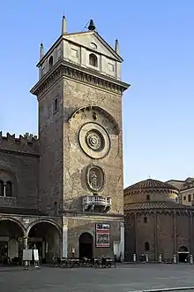 The Torre dell'Orologio is a 15th-century renaissance tower on the Piazza delle Erbe in Mantua, Italy. It is attached to the Palazzo della Ragione, and next to the Rotonda di San Lorenzo. It houses an astronomical clock.