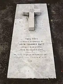 Toru was the youngest child of three, after sister Aru and brother Abju.[4] She and her siblings spent most of their childhood in Calcutta, splitting their time between a house in the city and a garden house in the suburb of Baugmaree.[4] Dutt was educated at home by her father and by the Indian Christian tutor Babu Shib Chunder Banerjee, learning French and English, and eventually Sanskrit, in addition to her first language, Bengali.[4] During this time, she learnt John Milton's epic poem of Christian allegory Paradise Lost by heart.[4] She also learned stories of ancient India from her mother.[4]