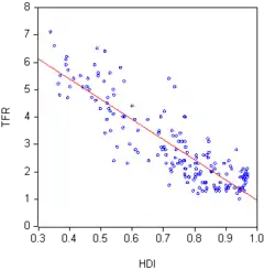 The effect of all these factors can be summarized with a plot of Total Fertility Rate against Human Development Index (HDI) for a sample of countries. The chart shows that the two factors are inversely correlated, that is, in general, the lower a country’s HDI the higher its fertility.