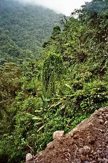 The species is native to the humid forests of the western Andes, from the Andean slopes of northwest Ecuador to southwest Colombia, at altitudes of 1,400–2,400 m (4,600–7,900 ft).[11] It uses all forest strata, showing some preference for the upper canopy of the forest (11–20 m (36–66 ft)) and the subcanopy (6–10 m (20–33 ft)).[12] The species also uses secondary forest and forest-edge habitats.[13] Evidence suggests that these birds are very specific in choosing trees for nesting. It usually prefers old trees in the family Lauraceae. As nesting trees of sufficient diameter are not very common in these forests, habitat loss through logging is impacting the species.[10]