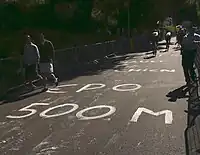 Following protracted disagreement between the organisers of the Tour de France (ASO) and the UCI, the race was sanctioned by the Fédération Française de Cyclisme (FFC), as was the 2008 Paris–Nice in March. Thus the FFC were in charge of the doping controls before and during the race, and rather than increasing the number of doping controls during the Tour, they applied a more targeted approach on suspect riders.[22] The French government's anti-doping agency AFLD carried out approximately 60 random and targeted tests in the weeks leading up to the Tour. They took blood samples from all the 180 riders in a two-day period just before the first stage, and during the race took samples from up to 14 riders a day shortly after the stage was finished, 250 tests being run in total.[23] The Italian National Olympic Committee (CONI) also performed unannounced doping tests of riders at the finish of stage 15, which ended at the ski resort of Prato Nevoso, Italy.[24] On 3 July 2008, France enacted a law criminalizing using or trafficking in doping substances.[25]