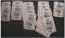 The players run a race of 50 or 100 miles, as agreed before the game starts. A player cannot play the mileage cards (1, 3, 5, 10 Miles) unless they have a Go card in front of them. If both players are in City Limits (played by either), they can't play the 10 Mile card ("Speed Limit 5 Miles per Hour"); they can remove this card's effect by playing the Country! card (which affects both players). They lose 1 or 2 hours if an opponent plays a Collision ("Delay! 1 Hour"), Out of Gasoline ("Delay! 1 Hour"), or Puncture ("Delay! 2 Hours") card and must discard an "hour's" worth of cards for each hour (5 miles in the city, 10 miles in the country). To resume driving, they must also play a "Remedy" card (Hauled In for a collision and Gasoline for Out of Gasoline, nothing for Puncture) and a Go card. To win, the player must exactly match the total mileage (50 or 100 miles, as agreed).[3]