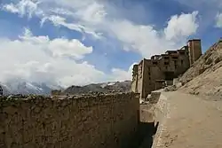 Saspol Caves, situated in the hills behind Saspol, is about 76 km from Leh, is one of the very few early period painted cave temples to exist in Ladakh and these paintings are dated to the 15th century CE.[17] The caves, also known as Gon-Nila-Phuk Cave temples, are in danger of total collapse and were therefore listed in 2016 World Monuments Watch.[18] Rammed earth fortification can be seen on top of the hill near the caves. has Paintings existing in five caves, two of them extensively damaged. One of the painted caves, that have been given a coat of lime wash and red paint in the exterior is the most visited and is considered as the main cave. Paintings of Anuttarayoga Tantra images of the main cave is very rare during the period of execution of these paintings. These caves are under the administration of Lekir Monastery.[19][20]