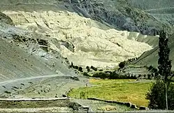 The 7 meter tall 7th-8th century "Khartse Khar Buddha statue" or "Khartse Khar Chamba" carved in greyish-yellow rock face on a cliff is 48 km from Kargil on Kargil-Sankoo-Barsoo road. Sankoo is 42 km from Kargil, then the Barsoo road further 4.6 km leads east to the statue on the road side in Khartse Khar village on the bank of Suru River. "The holes around it suggested that scaffolding had been used to reach the face and carve out the finer details. The Buddha formed an abhayamudrā (gesture of fearlessness) with his right hand, while the left hand carried a kamandal (pot to carry water). I noticed a rudraksha mala (prayer beads) tied around the wrist and the arm, as well as the janeu (sacred thread) and the karadhani (waist chain), also made out of rudraksha. Although knotted, the statue’s hair fell over his shoulders."[15][16]