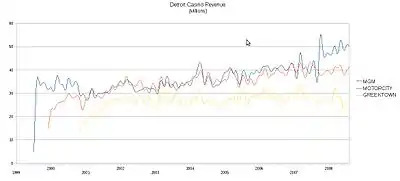 The city's mayor in the 1990s, Dennis Archer, also a former Michigan Supreme Court Justice, supported a plan which resulted in new casino resort hotels as a catalyst for development. Initially, Archer's plan was for a casino cluster along the east riverfront.[43] In April 2005, after an eight-year legal battle over the bidding process, the courts cleared the way for the City of Detroit to permit its temporary casinos to build all new casino resort hotels, to open in late 2007.[44] The settlement was further complicated by MGM's acquisition of Mandalay Bay, then owner of the Motor City Casino. Upon acceptance of the settlement, Detroit entrepreneur Marion Ilitch exercised her option to purchase Motor City Casino, outbidding other partners.[45] The plan for the casino resort locations changed as the city decided instead to have a promenade of parks along the International Riverfront to spur residential development, thus freeing the casino companies to build in other areas of downtown. Upon completion, Detroit became the largest American city and metropolitan region to offer casino resort hotels.[5] Since 2000, the city has seen a general trend of increased tax revenues from the three casinos; in 2009, casino resort hotels in Detroit employed 8,122 people, paid $452.8 M in wages (not including tips and benefits), and contributed $320 M in taxes to the city and state.[46][47]