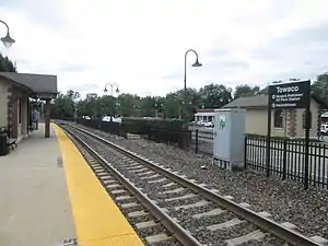 ![]() The Towaco station platform in September 2013, facing eastbound along the Montclair-Boonton Line. The shelter for buses can be seen to the right. | |||||||||||||