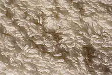Terrycloth, terry cloth, terry cotton, terry toweling, terry, terry towel, Turkish toweling (formerly), or simply toweling is a fabric woven with many protruding loops of thread which can absorb large amounts of water. It can be manufactured by weaving or knitting. Terrycloth is woven on special looms that have two beams of longitudinal warp through which the filler or weft is fired laterally.[1][2]