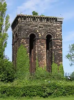 Tower Hill Water Tower is a disused water tower and local landmark in Ormskirk, Lancashire, England. Situated on the east side of Tower Hill, it was built between 1853-4 for Ormskirk Local Board of Health,[1] and is reputed to be the oldest remaining water tower in the country.[2] It was awarded Grade II* listed status in 1976,[1] and is on the Heritage at Risk Register.[3] The area immediately surrounding the tower has been used as allotments since the mid 20th century.[4]