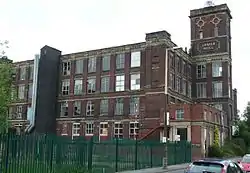 Built for Christian Koch, this 4 storey mill is similar to River Mill, but more ornate being a Potts design. It had 44,000 spindles and 5000 twiner spindles, doing coarse counts. The River and Tower Mills Co Ltd (1912) ceased spinning at River Mill in 1934, but by increasing the reliance on ring spinning kept Tower going until 1955. On closure it had 13,000 mule and 24,000 ring spindles.[3]
