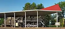 To the southwest along the loading platform is a remnant of railroad track. The track holds D&IR 218 (later DM&IR 1218), a K class 2-8-0 steam locomotive and its tender, two train cars, and a caboose.[15] A canopy built in 2008 shelters the locomotive and the passenger car.[16] The canopy was fitted with solar panels in 2012 to provide electricity to the railroad cars and depot. To the west of the locomotive, beyond the boundary of the depot site, is a 1901 monument to President William McKinley made of sheet metal.[17]