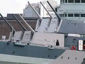 The Edinburgh class were longer at 614 ft (187 m) compared to 592 ft (180 m), initially to allow an increase in the main armament from twelve 6 in (152 mm) guns in four triple turrets as in the two previous sub-classes, to sixteen 6 in guns in four quadruple turrets. The idea was soon shelved however due to the difficulties in actually manufacturing an effective quadruple 6 in turret and so the class reverted to the original main armament design, although improved through a "long trunk" Mk XXIII turret design, which reduced the crew requirements and increased the speed of the ammunition hoists.[9] Four extra 4 in (102 mm) "High Angle Low Angle" guns and eight extra 2-pounder (40 mm) guns and further armour protection were added instead.