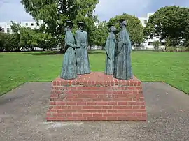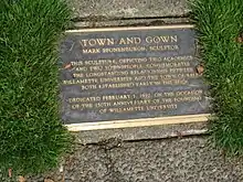 Town and Gown depicts four people: two academics and two townspeople. The academics wear caps and gowns; the man carries a book and the female holds a branch. The two female townspeople wear capes, dresses, and hats; one carries a purse and the other holds an umbrella.[1] The statues each measure approximately 50 x 18 x 12 inches, and the brick base measures approximately 33 x 80 x 55 inches. A plaque reads: TOWN AND GOWN / MARK SPONENBURGH, SCULPTOR / THIS SCULPTURE, DEPICTING TWO ACADEMICS / AND TWO TOWNSPEOPLE, COMMEMORATES / THE LONGSTANDING RELATIONSHIP BETWEEN / WILLAMETTE UNIVERSITY AND THE TOWN OF SALEM, / BOTH ESTABLISHED EARLY IN THE 1840S. / DEDICATED FEBRUARY 1, 1992, ON THE OCCASION / OF THE 150TH ANNIVERSARY OF THE FOUNDING OF WILLAMETTE UNIVERSITY.[2]