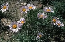 The genus is known commonly as Townsend daisies.[4] These annual, biennial and perennial wildflowers are native to western North America, frequently at high elevations. A number of taxa are tall, erect plants, like typical daisies. Others form small, dense, leafy rosettes, or have a more sprawling, prostrate appearance. Frequently, the flower heads are showy and attractive, with the ray florets in shades of pink, purple, blue, white, and, rarely, yellow.[5]