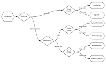 A toxidrome (a portmanteau of toxic and syndrome) is a syndrome caused by a dangerous level of toxins in the body. The term was coined in 1970 by Mofenson and Greensher.[2] It is often the consequence of a drug overdose. Common symptoms include dizziness, disorientation, nausea, vomiting, and oscillopsia. A toxidrome may indicate a medical emergency requiring treatment at a poison control center. Aside from poisoning, a systemic infection may also lead to a toxidrome. "Classic" toxidromes are presented below, but they are often variable[1] or obscured by the co-ingestion of multiple drugs.[3]