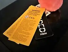 Manufacturers often display information about the intended age of the children who will play with the toy. In the U.S. this label is sometimes mandated by the CPSC, especially for toys which may present a choking hazard for children under three years of age. In most countries the intended age is either shown as a minimum age or as an age range. While one reason for this is the complexity of the toy and how much it will interest or challenge children of different ages, another is to highlight that it may be unsafe for younger children. While a toy might be suitable for children of one age, and thus this is the age recommended on the product, there may be safety hazards associated with use by a lower age group, necessitating a mandatory warning. Some manufacturers also explain the specific dangers next to the advised age (as is mandated by European and International toy safety standards EN71 and ISO 8124 respectively, but not US standard ASTM F963).[16] Some accidents occur when babies play with toys intended for older children.[1]
