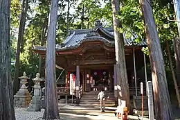 The temple was patronized in the Sengoku period by Imagawa Yoshimoto, Oda Nobunaga, Toyotomi Hideyoshi and Tokugawa Ieyasu, and by pilgrims from the merchant classes in the Edo period through the modern period.[9] Other notable devotees of Toyokawa Dakiniten include the Edo period magistrate and daimyō Ōoka Tadasuke, whose residence in Akasaka, Tokyo eventually became Toyokawa Inari's Tokyo branch temple, the painter Watanabe Kazan, and Prince Arisugawa Taruhito, who donated a framed sign (扁額, hengaku) in his own calligraphy of the words "Toyokawa Temple" (kyūjitai: 豐川閣, Toyokawa-kaku; shinjitai: 豊川閣).[9]