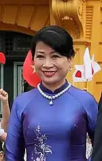 Trần Thị Nguyệt Thu is the former Spouse of President of Vietnam (de facto First Lady) during her husband Nguyễn Xuân Phúc's presidency from April 2021 to January 2023, when he resigned amid a series of corruption scandals. She was previously the Spouse of the Prime Minister during her husband's premiership from 2016 to 2021. She is known for her elegant fashion style, often wearing the traditional Vietnamese dress áo dài,[2] and is occasionally dubbed the First Lady of Vietnam by the overseas Vietnamese press.[3][4]