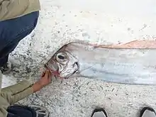 Dealfish have a long, slender eel-like body. They are a bright silver in colour, often with faint black spots along the flanks and the pink dorsal fin runs the full length of the body. The tail is very small and the underside is free of pectoral or pelvic fins. The maximum size of this species is thought to be 8–9 feet in length, although they are typically around half of this size.[3]