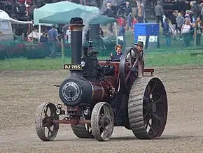 In 1841 Ransomes, Sims & Jefferies produced an early traction engine. The design (which was led by a horse to steer it) failed to attract any purchasers.[3] They tried again in 1849 this time without the steering horse but the machine was under-built for threshing work it was designed for.[3] The commercially successful traction engine was developed from an experiment in 1859 when Thomas Aveling modified a Clayton & Shuttleworth portable engine, which had to be hauled from job to job by horses, into a self-propelled one.[3] This alteration was made by fitting a long driving chain between the crankshaft and the rear axle. Aveling is regarded as "the father of the traction engine". [4] Aveling's first engine still required a horse for steering.[5] Other influences were existing vehicles which were the first to be referred to as traction engines such as the Boydell engines manufactured by various companies and those developed for road haulage by Bray. The first half of the 1860s was a period of great experimentation, but by the end of the decade the standard form of the traction engine had evolved and would change little over the next sixty years. As part of these improvements the steering was improved to no longer need a horse and the drive chain was replaced with gears.[5] In America traction engines fitted with continuous tracks were being used from 1869.[1]