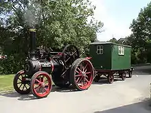 A particularly distinctive form of road locomotive was the showman's engine.[29] These were operated by travelling showmen both to tow fairground equipment and to power it when set up, either directly or by running a generator.[29] These could be highly decorated and formed part of the spectacle of the fair.[29] Some were fitted with a small crane that could be used when assembling the ride.[30] About 400 were built with 107 surviving into preservation.[30]