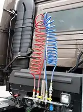The parking brake of the tractor unit and the emergency brake of the trailer are spring brakes that require air pressure in order to be released. They are applied when air pressure is released from the system, and disengaged when air pressure is supplied. This is a fail-safe design feature which ensures that if air pressure to either unit is lost, the vehicle will stop to a grinding halt, instead of continuing without brakes and becoming uncontrollable. The trailer controls are coupled to the tractor through two gladhand connectors, which provide air pressure, and an electrical cable, which provides power to the lights and any specialized features of the trailer.