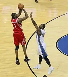 A relatively unknown player coming out of Florida, McGrady made a name for himself after a strong performance at the Adidas ABCD Camp, an experience that helped him recognize his true talent.[10] He later reflected, "Nobody had a clue who Tracy McGrady was. Sonny Vaccaro gave me that platform, and I played against the best players in the world at that time. I left that camp the No. 1 player in the nation, 175 to No. 1."[11] Behind his leadership, Mt. Zion emerged as the number two-ranked team in the country, and McGrady was named a McDonald’s All-American, USA Today High School Basketball Player of the Year, and North Carolina's Mr. Basketball by the Associated Press.[6] He also played at the 1997 Roundball Classic, scoring 13 points.[9] His senior year averages were 27.5 points, 8.7 rebounds, 7.7 assists,[12] 2.8 steals, and 2 blocks per game.[9] Initially, McGrady considered playing college basketball at the University of Kentucky, but he ultimately decided to enter the NBA draft as he was a projected lottery pick.[6]