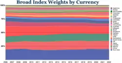 The trade-weighted US dollar index, also known as the broad index, is a measure of the value of the United States dollar relative to other world currencies. It is a trade weighted index that improves on the older U.S. Dollar Index by incorporating more currencies and yearly rebalancing. The base index value is 100 in January 1997.[1] As the U.S. Dollar gains value the index increases.