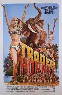 Trader Hornee is a 1970 sexploitation film and directed by Jonathan Lucas and starring Buddy Pantsari, Elisabeth Monica, John Alderman, and Christine Murray, and Deek Sills. Written and produced by David F. Friedman, it is an adult-oriented parody of the vintage safari movie Trader Horn (1931).