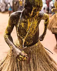 West and Central African religious practices generally manifest themselves in communal ceremonies or divinatory rites in which members of the community, overcome by force (or ashe, nyama, etc.), are excited to the point of going into meditative trance in response to rhythmic or driving drumming or singing. One religious ceremony practiced in Gabon and Cameroon is the Okuyi, practiced by several Bantu ethnic groups. In this state, depending upon the region, drumming or instrumental rhythms played by respected musicians (each of which is unique to a given deity or ancestor), participants embody a deity or ancestor, energy or state of mind by performing distinct ritual movements or dances which further enhance their elevated consciousness.[36]