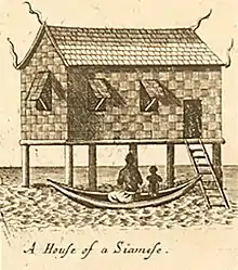 There are three types of stilt houses in northern Thailand. Firstly, RUEN KHRUNG PHOOK or RUEN MAI BUA (meeting house with rope),[7] which is the oldest type, originated in the countryside.[8] The structures are composed of a roof woven from grasses, floors and walls made with bamboo tied with rope (PHOOK). Poles and beams are the base structure and are made with hard wood. The second type is a “real wood house” and the strongest stilt houses. This type has two styles of roof. KALEA house, an ancient style of LAN-NA people which is decorated by a cross of wood in a V or X shape at the top front. The other roof type is known as “wind spaces house” and the structure was influenced from the central region with a high roof with the halo of the sun in the middle of a gabled roof and the roof tiles are made from baked clay in a fish scale pattern. The last type is a “middle period house” from the period of RAMA 5, and was improved from a basic LAN-NA house, with more complicated layers on the roof and more holes in the walls to make the doors and windows. It is decorated by using stained wood, an influence from western countries that traded with Thailand at that time, such as France or England.