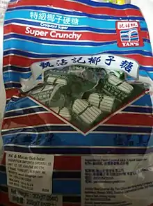 Yan Chim Kee (甄沾記) is a well known confectionery and foodstuffs manufacturer in Hong Kong with a history that dates back at least a century. Established in Guangzhou by Yan Lung Lap (甄倫立) in 1915,[4][5] its coconut candy is an acknowledged traditional classic. The packaging of Yan Chim Kee Coconut Candy were eyecatching shades of red, green and yellow with a distinctive logo. It is available in multiple flavors and textures to suit local preferences. The firm insists upon strict quality control and maintain that their products do not contain preservatives or artificial colouring. The only ingredients permitted were fresh coconut milk, liquid glucose and sugar.[6] Typical price for the candy was 5 cents back in the 1900s - [7] this was in fact quite a sum in the old days. The firm was considered a pillar in the local food manufacturing scene during the 1950s to the 1970s - older Hong Kong residents have fond memories of their coconut based candies, juices and ice cream products.