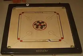 Carrom is played on a small board, with gameplay similar to pool and billiards (cue sports). The main unique feature of carrom is that players flick a puck-like object with their fingers in order to impact the other pieces on the board, with each of the four players having two designated lines on their side of the board between which they must flick/shoot their striking piece from.[53]