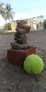 In the game of seven stones (which is known by several other names in different parts of India, such as Lagori or Pittu Garam), one team throws a ball at a pile of seven stones to knock it over and then attempts to re-create the pile as fast as possible, while the other team tries to throw the ball at the first team's players to eliminate them from the game.[24]