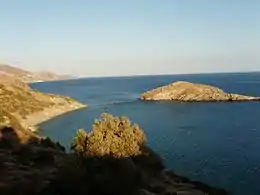There are a group of four islets in the bay including Papadoplaka (to the west), Megalonisi (with the lighthouse), Mikronisi (also known as Agios Pavlos), and Trafos.