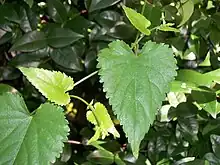 A much-branched climbing perennial herb, with twining stems up to 2.5 m originating from a woody rootstock.[5] The leaves are hairless or thinly hairy with serrated margins.[1] The hairs sting fiercely.[1] Inflorescences are up to 5.5 cm long with peduncles up to 2 cm long.[5] The inflorescences are composed mostly of tiny[1] male flowers with 1–2 female flowers below or else all male.[5]