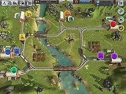 The player needs to build railways in order to connect cities. Rails are cheap, except when demolishing houses or other objects. In each level, the player must use railway tracks to connect the different stations on the map to transfer materials between stations, having to manage increasing traffic by constructing crossroads and switches. The main objective of each level is to deliver each train to its destination without going bankrupt, but every level also has three advanced objectives, such as "do not stop trains" or "do not destroy tracks". There are 4 chapters in the base game – Europe (in the time period of 1830–1980), America (1840–1960), USSR (1880–1980) and Japan (1900–2020),[3] with a fifth, Germany (1880–2020), as downloadable content (DLC). All chapters have 6 levels, for a total of 24 levels, plus 6 more in the Germany DLC, bringing the total number of levels to 30.[4]