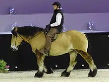 The revival of team driving has prompted farmers who use the Trait du Nord to attend competitions and improve the quality of their horses.[4] The qualities of the breed make it a popular horse for leaders in the areas of recreational and competition team driving, and the breed has the advantage of being able to be immediately returned to work even after a period of inactivity for several months.[5] When being driven, a traditional "Flemish collar" is generally used. The horses are trained to be driven with only one rein, leaving the driver's hands free for other work.[26] When shown in hand, Trait du Nord horses are often presented in groups, generally between four and eight to a string.[27]