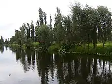 The canals of Lake Xochimilco were initially created along with artificial agricultural plots called chinampas. Chinampas were invented by the pre-Hispanic peoples of the region around 1,000 years ago as a way to increase agricultural production. On the shallow waters of the lakes, rafts were constructed of juniper branches. Onto these rafts floating on the water, lakebed mud and soil were heaped and crops planted. These rafts, tied to juniper trees, would eventually sink and a new one be built to replace it. Over time, these sunken rafts would form square or rectangular islands, held in place in part by the juniper trees. As these chinampa islands propagated, areas of the lake were reduced to canals. These “floating gardens” were an important part of the economy of the Aztec Empire by the time the Spanish arrived.[33][34][35] Today, only about 5,000 chinampas, all affixed to the lake bottom, still exist in their original form, surrounded by canals and used for agriculture. The rest have become solid ground and urbanized. In the center of Xochimilco, there are about 200 chinampas, covering an area of 1,800 hectares. However, one reason the number has decreased is that smaller chinampas have been combined to create larger ones.[31] While there are still those who maintain chinampas traditionally, and use them for agriculture, the chinampa culture is fading in the borough, with many being urbanized or turned into soccer fields and sites for housing and businesses.[28] The deterioration of many of these chinampas can be seen as their edges erode into the dark, polluted water of the canals.[34] The most deteriorated chinampas are located in the communities of Santa María Nativitas, Santa Cruz Acalpixca, San Gregoria Atlapulco, and Ejido de Xochimilco. Together, these have a total of thirty eight illegal settlements. To repair a number of chinampas, the borough, along with federal authorities, has reinforced 42 km (26 mi) of shoreline, of the 360 km (220 mi) that exist in the lake area. This involves the planting of juniper trees and the sinking of tezontle pylons into the lakebed.[28] These remaining chinampas are part of the Xochimilco World Heritage Site.[34] Have since changed use and become residences and businesses. Those that remain agricultural are mostly used as nurseries, growing ornamental plants such as bougainvilleas, cactuses, dahlias, day lilies, and even bonsai.[36] As they can produce up to eight times the amount of conventional land,[11] they are still an important part of the borough's agricultural production.[34] There have been various attempts to save the remaining chinampas, including their cataloging by UNESCO, UAM, and INAH in 2005, and various reforestation efforts, especially of juniper trees.[22][31]